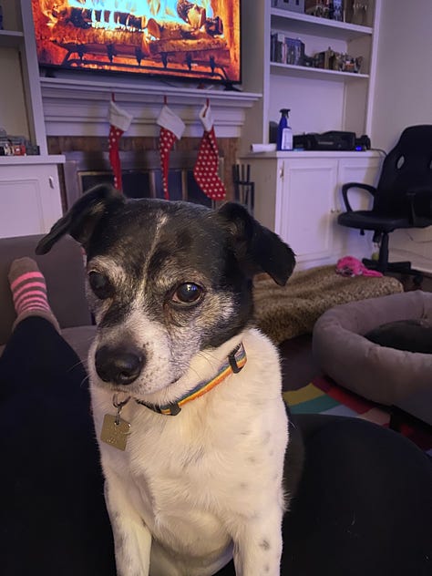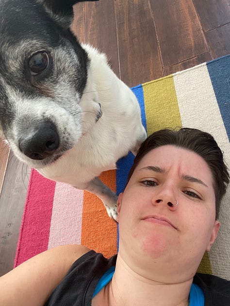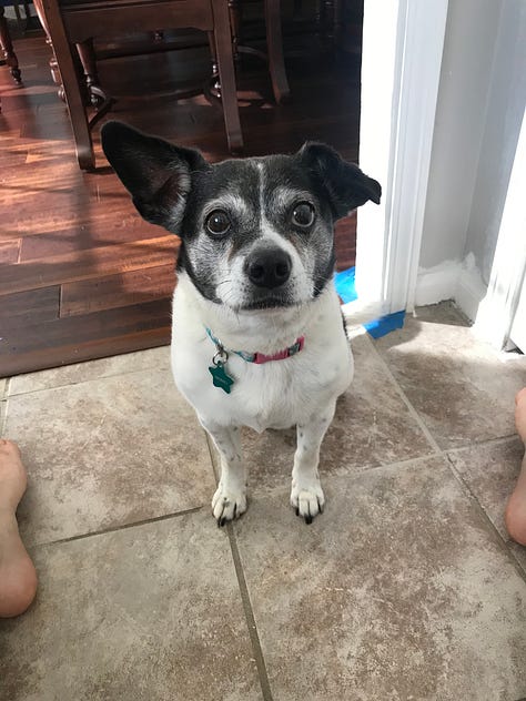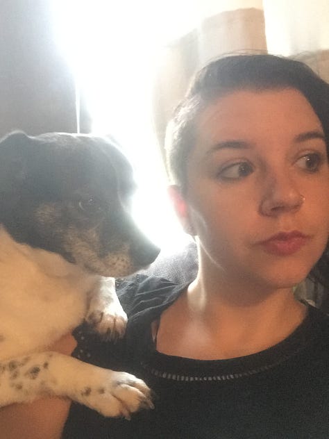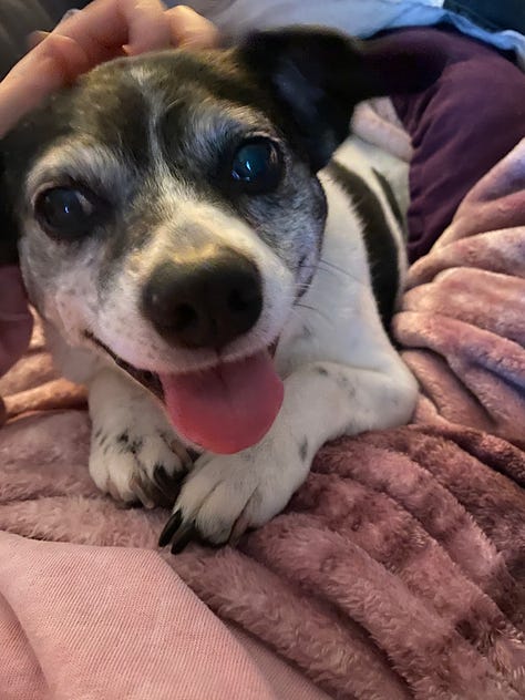 Of Momo’s seventeen years on this planet, she spent the last 15+ of those living with my husband Skyler. I entered the scene when she was four or five; at the time, I was roughly a year out of a crummy relationship with a high school sweetheart. I didn’t miss my ex one bit, but I sure did miss his dog. In my early conversations with Skyler, this was an easy opportunity to connect, and they mentioned that they had two very sweet dogs and if I wanted to come hang out sometime, I could pet them. (Hook, line, and sinker on that relationship, but I’ll gush about Skyler another time; Momo would want this to remain very much about her.)
