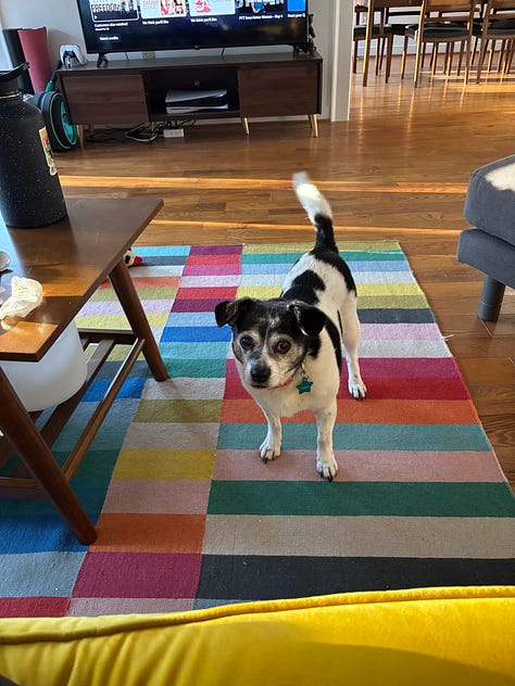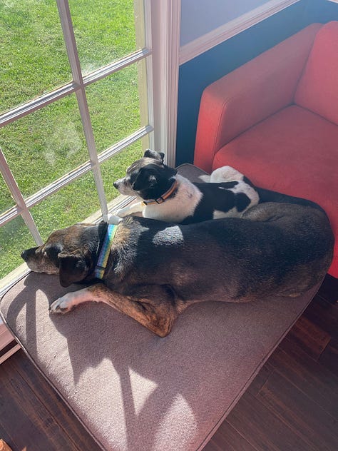 When we said goodbye to Harvey, we decided to do it at home, because my research suggested that it’s an easier transition for sibling pairs. When you take one dog away and come home empty handed, it can lead to a fair degree of anxiety and depression in the remaining dog. I read stories of pets walking around their houses over and over, looking for their sibling, which struck me as endlessly heartbreaking. Despite the obvious power imbalance, Harvey and Momo were buddies, always together in a Kronk-and-Yzma sort of way (IYKYK), and they even shared a crate if they ever needed to be boarded at the vet.